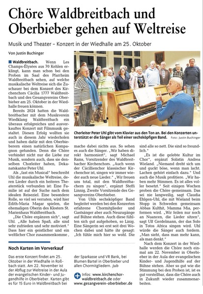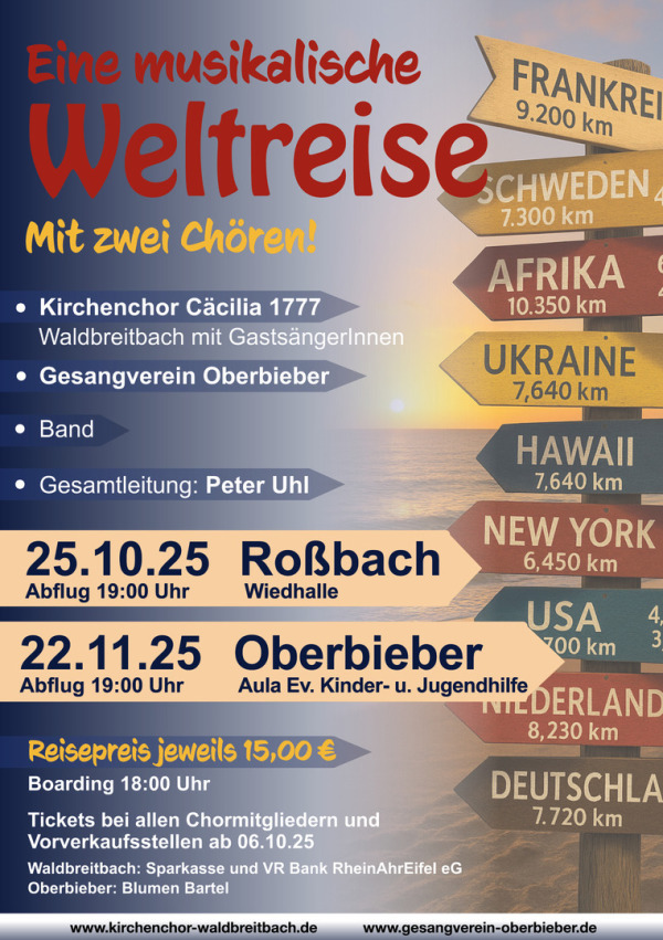 Wir freuen uns, zusammen mit dem Kirchenchor Waldbreitbach und deren Gastsänger und Sängerinnen und unserem gemeinsamen Chorleiter Peter Uhl auf zwei musikalische Weltreisen zu gehen.